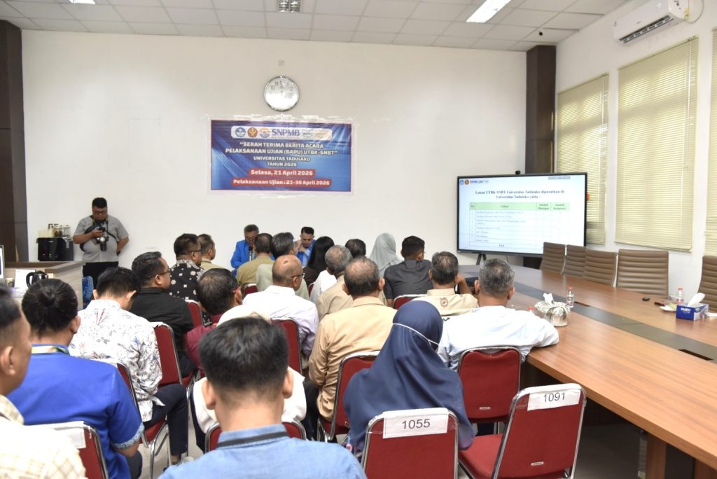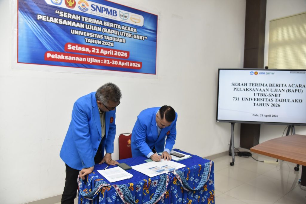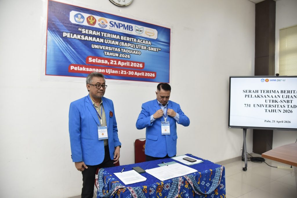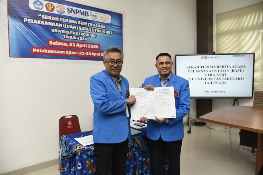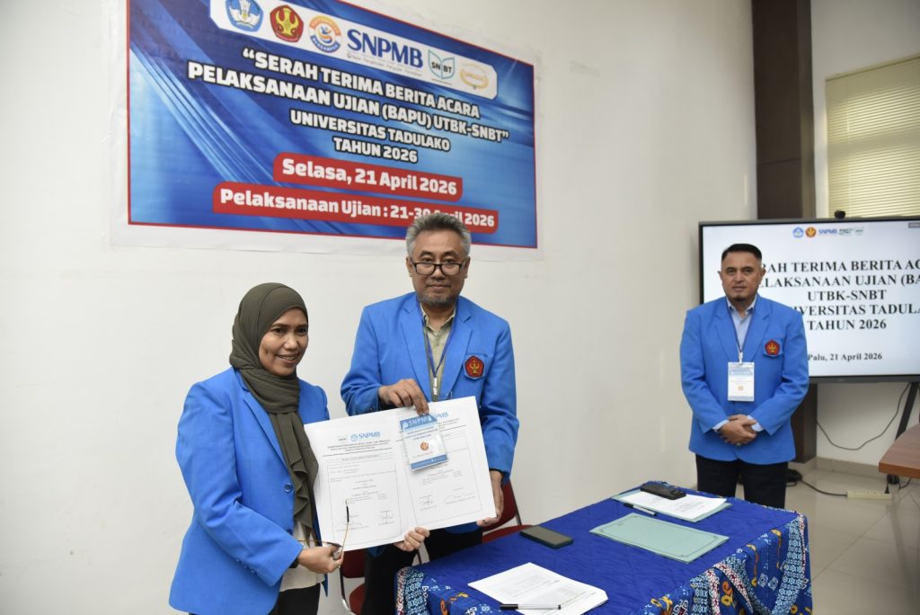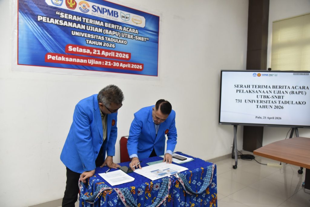 Universitas Tadulako laksanakan kegiatan serah terima berita acara pelaksanaan Ujian Tulis Berbasis Komputer Seleksi Nasional Berdasarkan Tes (UTBK-SNBT) Tahun 2026 yang berlangsung di Ruang Rapat Rektor Universitas Tadulako, Palu, Senin (21/4/2026). Kegiatan ini dihadiri oleh pimpinan universitas, panitia pelaksana, serta para penanggung jawab lokasi ujian sebagai bagian dari persiapan pelaksanaan UTBK-SNBT di lingkungan Universitas Tadulako.