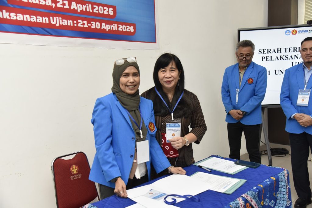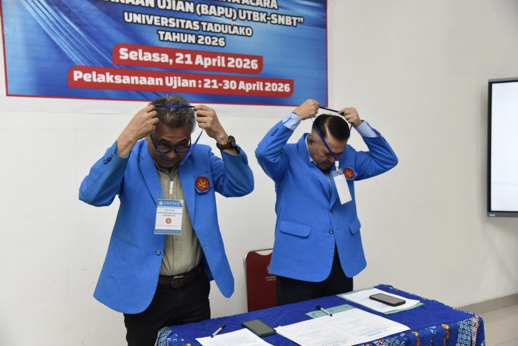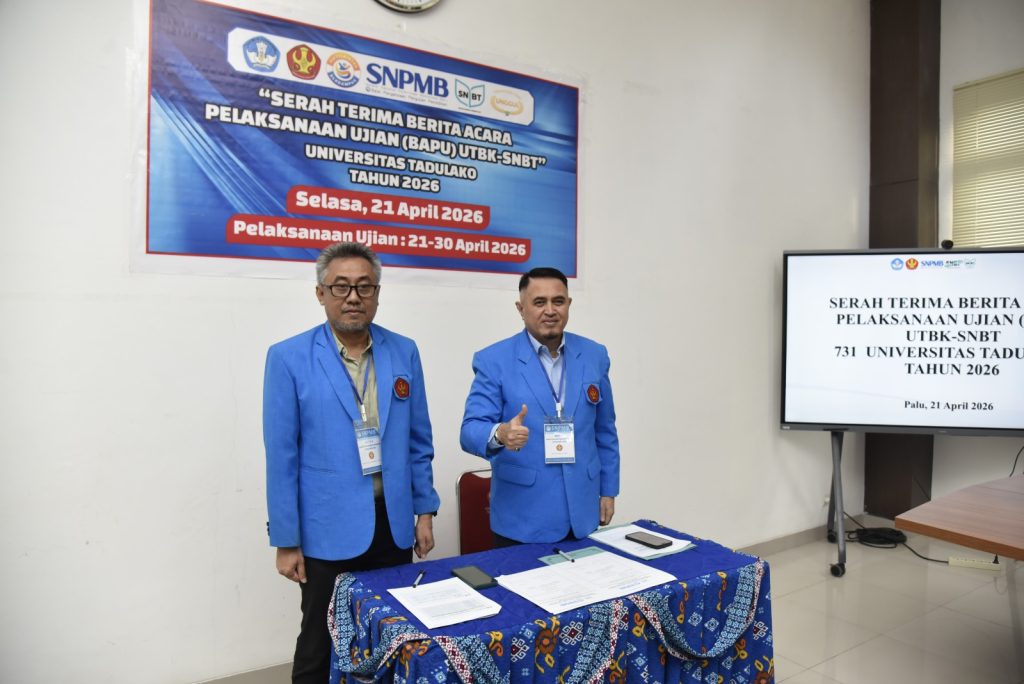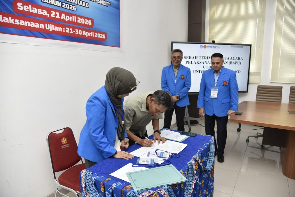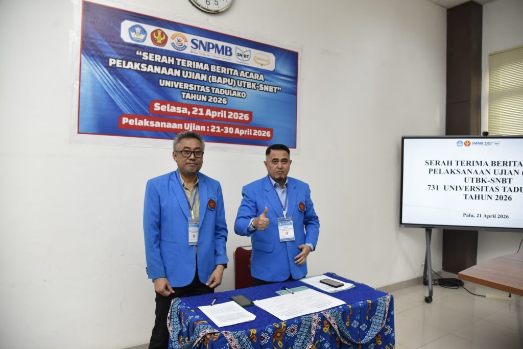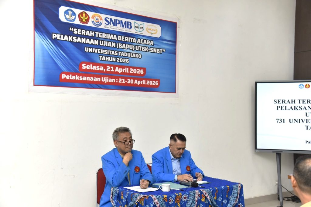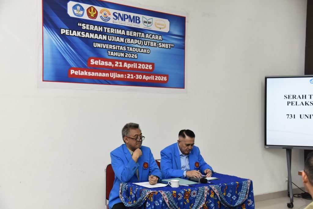 Universitas Tadulako laksanakan kegiatan serah terima berita acara pelaksanaan Ujian Tulis Berbasis Komputer Seleksi Nasional Berdasarkan Tes (UTBK-SNBT) Tahun 2026 yang berlangsung di Ruang Rapat Rektor Universitas Tadulako, Palu, Senin (21/4/2026). Kegiatan ini dihadiri oleh pimpinan universitas, panitia pelaksana, serta para penanggung jawab lokasi ujian sebagai bagian dari persiapan pelaksanaan UTBK-SNBT di lingkungan Universitas Tadulako.