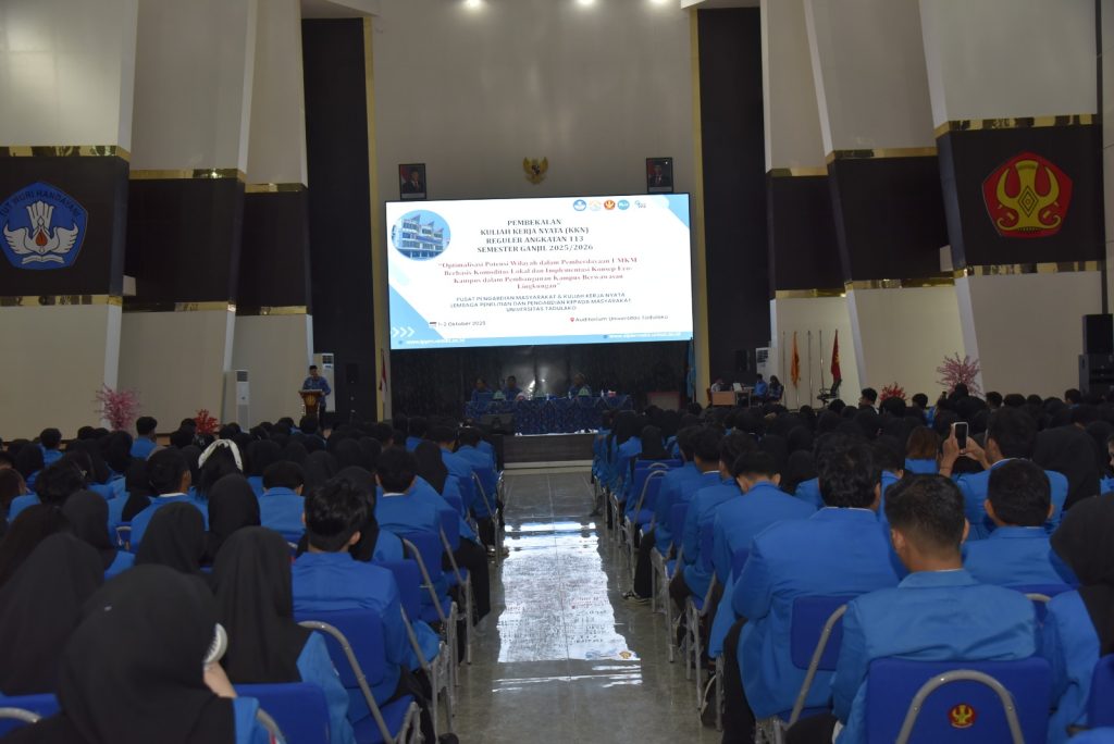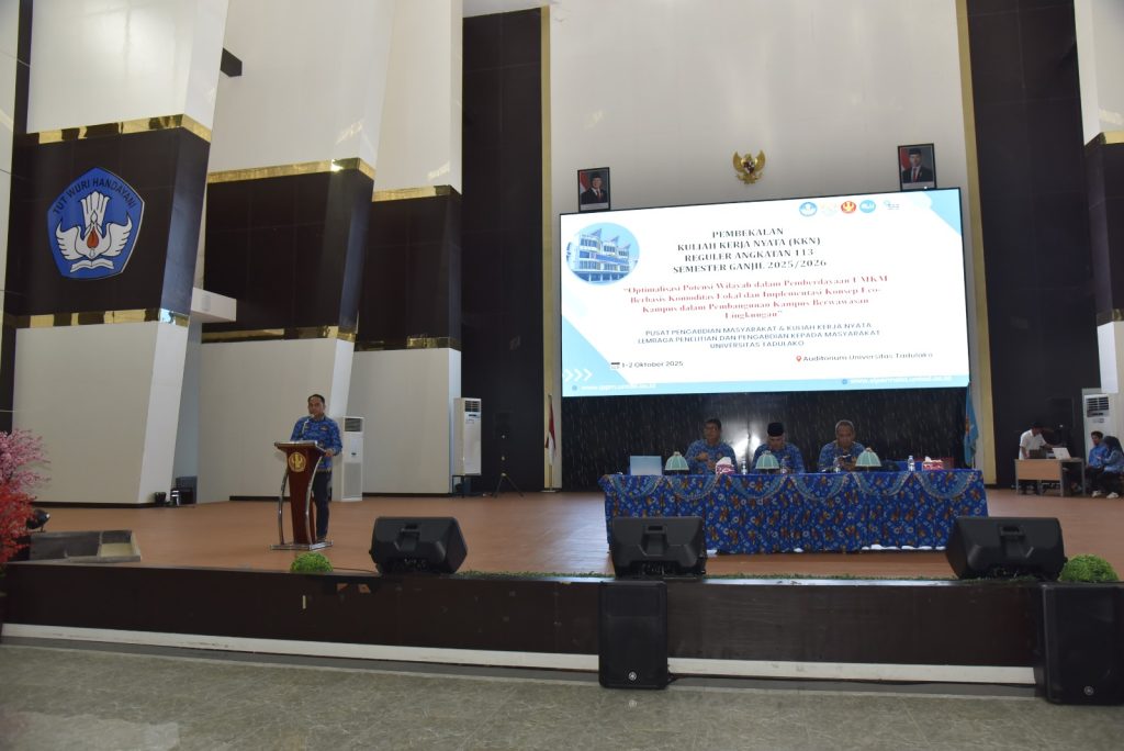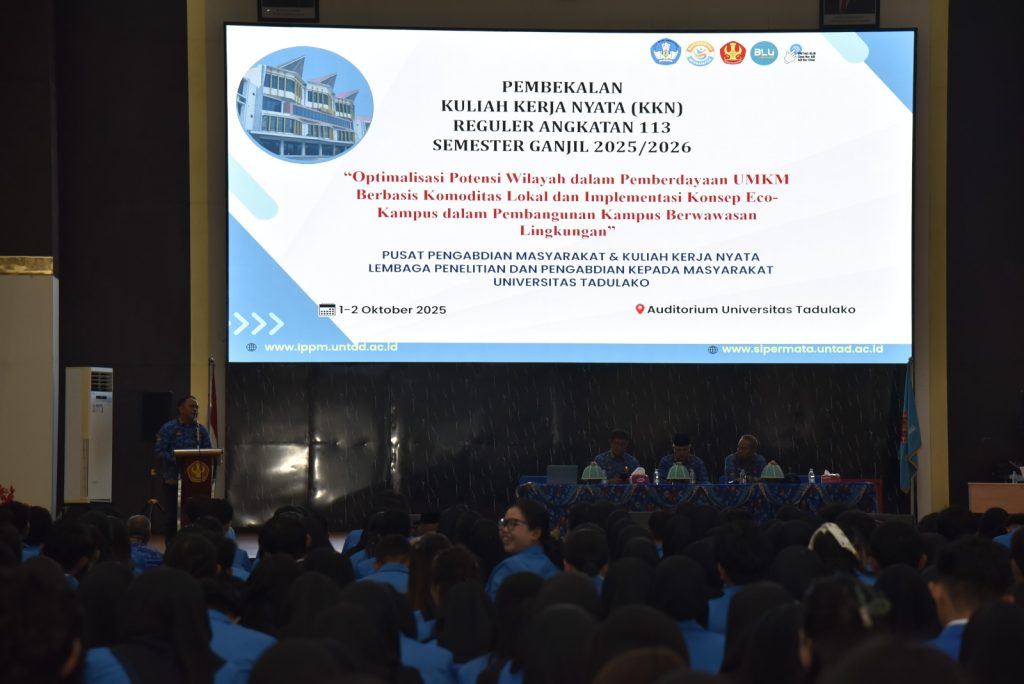 Rabu (01/10/2025) bertempat di Auditorium Aminuddin Ponulele Universitas Tadulako (Untad), melalui Pusat Pengabdian Masyarakat & Kuliah Kerja Nyata Lembaga Penelitian dan Pengabdian kepada Masyarakat (LPPM) Untad menggelar Pembekalan Kuliah Kerja Nyata (KKN) Reguler Angkatan 113 Semester Ganjil 2025/2026. Dengan memilih tema “Optimalisasi Potensi Wilayah dalam Pemberdayaan UMKM Berbasis Komoditas Lokal dan Implementasi Konsep Eco-Kampus dalam Pembangunan Kampus Berwawasan Lingkungan,” kegiatan ini dihadiri oleh jajaran pimpinan universitas, dosen pembimbing lapangan (DPL), serta mahasiswa peserta KKN.