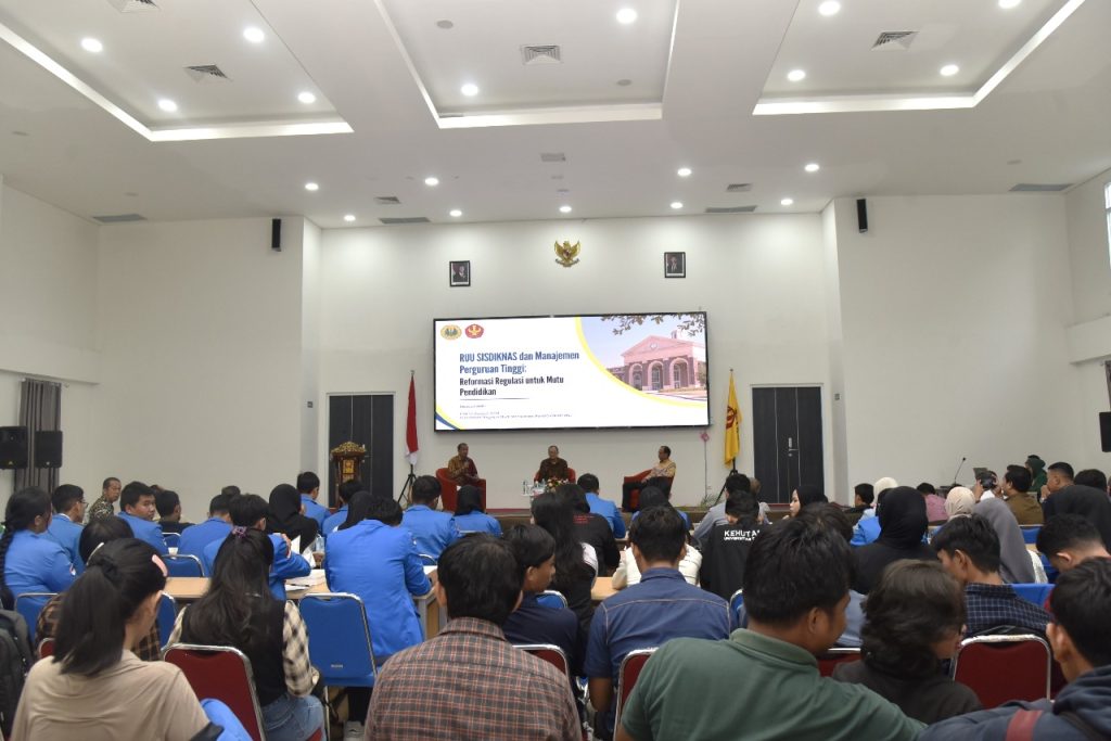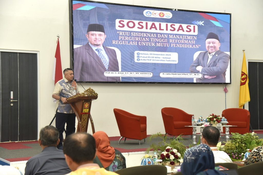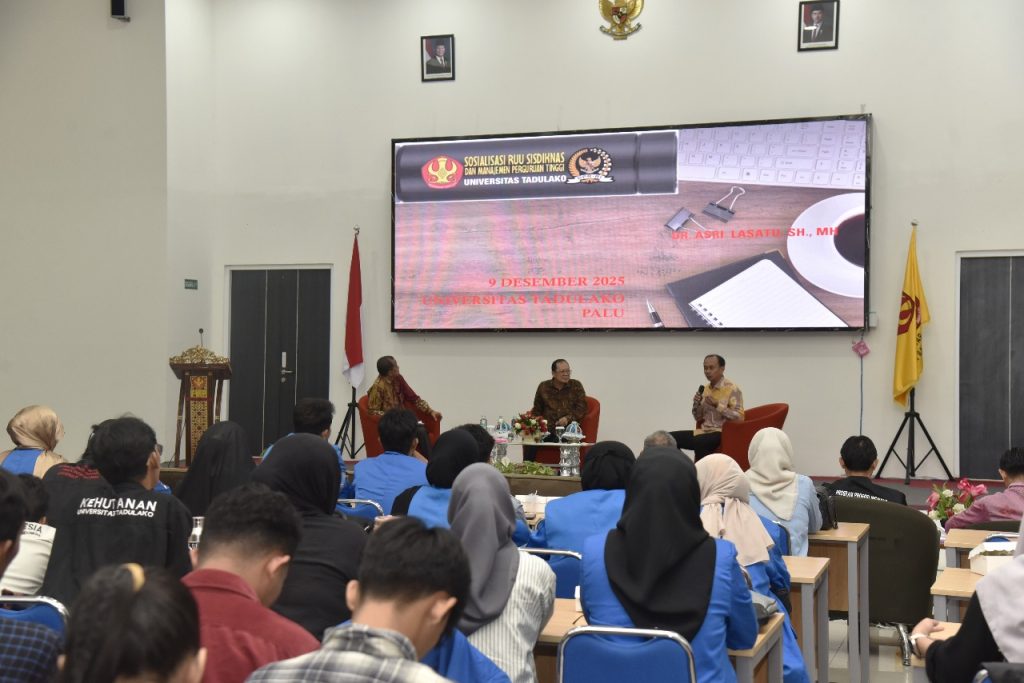 Bertempat di Aula FKIP Universitas Tadulako (Untad), Komisi X DPR RI bersama dengan Untad pada Selasa pagi (09/12/2025) menyelenggarakan “Sosialisasi RUU Sisdiknas dan Manajemen Perguruan Tinggi: Reformasi Regulasi untuk Mutu Pendidikan” yang dihadiri oleh Rektor Universitas Tadulako, Prof. Dr. Ir. Amar, S.T., M.T., IPU., ASEAN Eng., bersama dengan Wakil Ketua Komisi X DPR RI, H. Lalu Hadrian Irfani, S.T., M.Si., kemudian dua pemateri asal Universitas Negeri Jakarta dan Untad serta diikuti oleh segenap sivitas akademika dan Mahasiswa/i Untad.