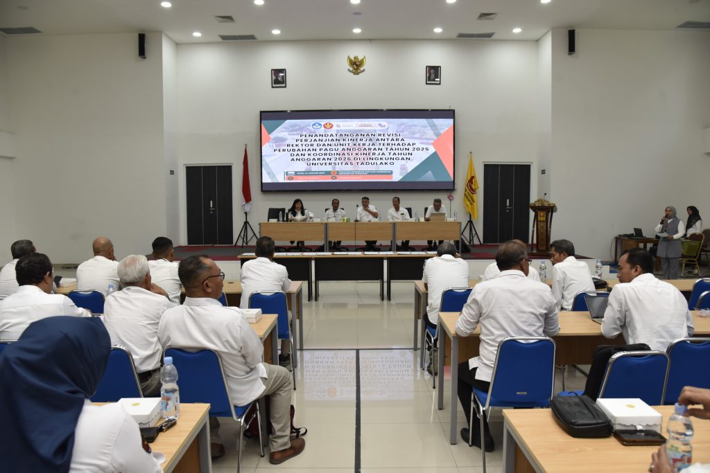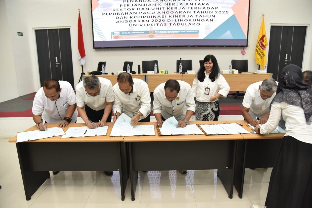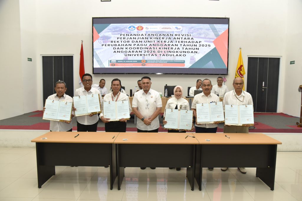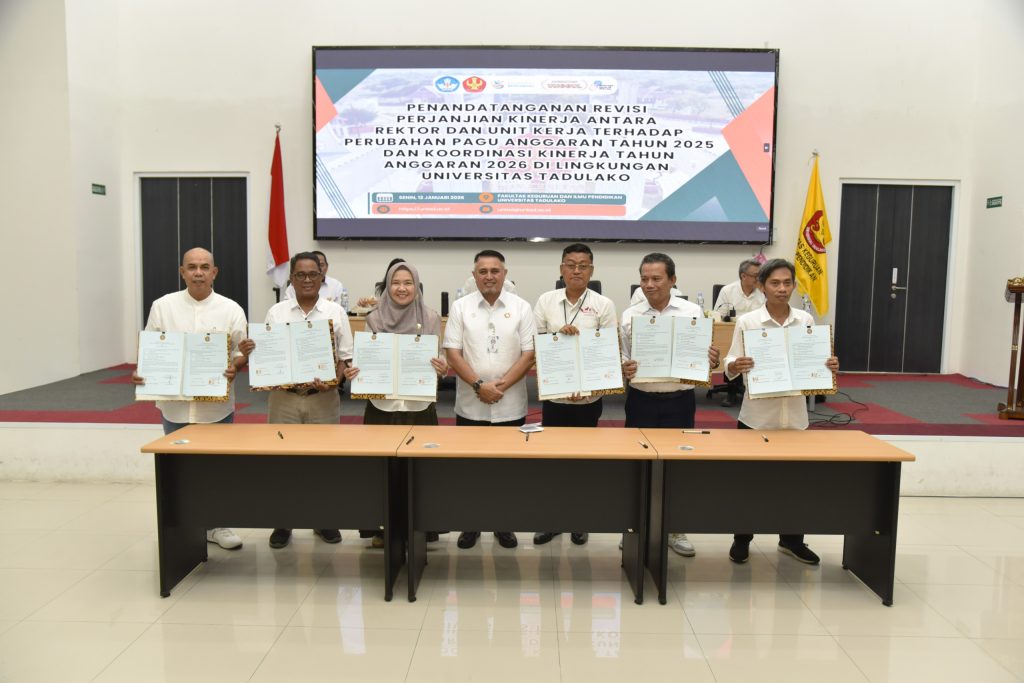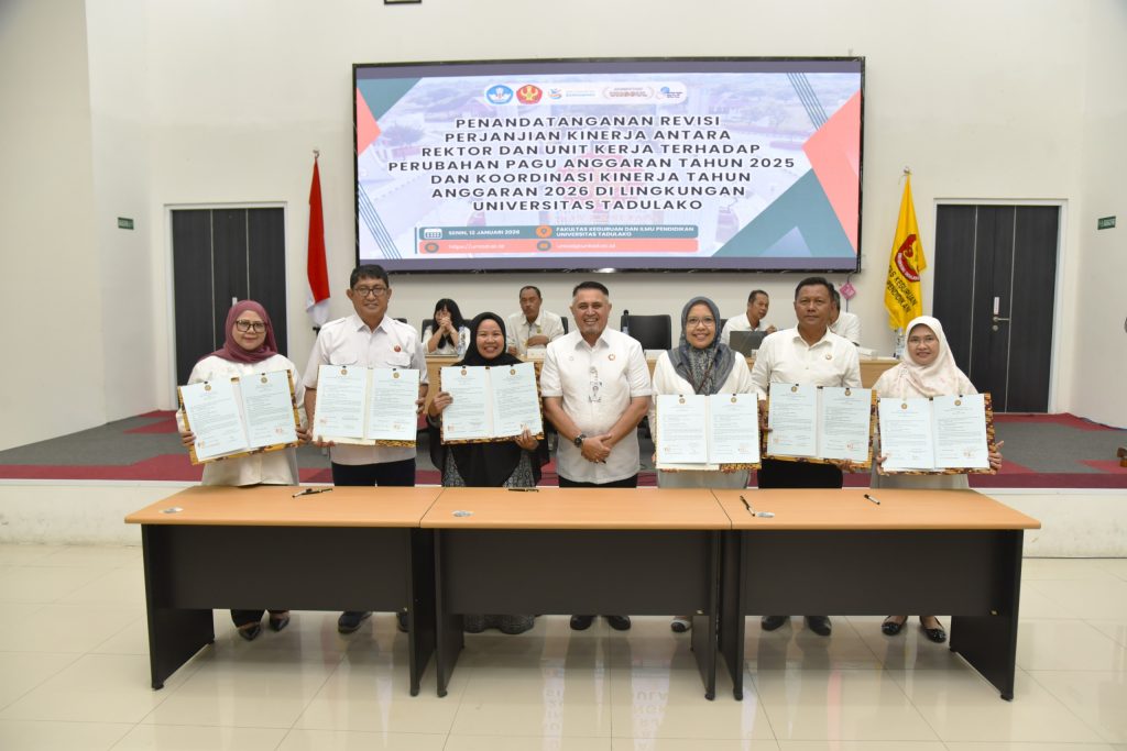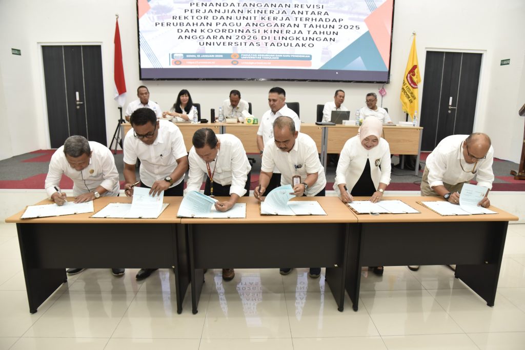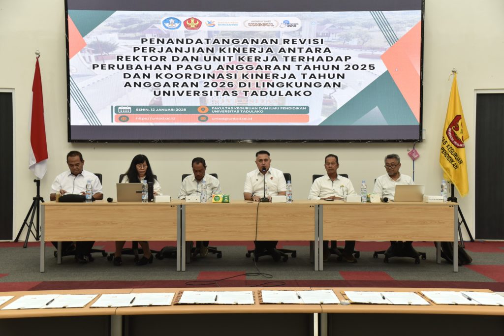 Senin (12/01/2026) bertempat di Aula FKIP, Universitas Tadulako telah menyelenggarakan kegiatan Penandatanganan Revisi Perjanjian Kinerja antara Rektor dan seluruh unit kerja sebagai tindak lanjut atas perubahan pagu anggaran Tahun Anggaran 2025. Kegiatan ini dirangkaikan dengan rapat koordinasi kinerja Tahun Anggaran 2026 yang dihadiri oleh seluruh jajaran pimpinan di lingkungan Universitas Tadulako.